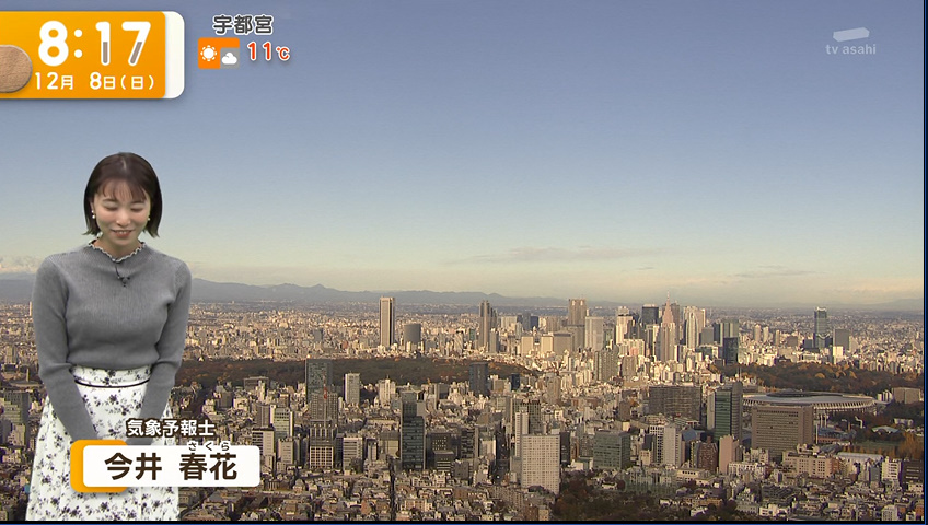 今井春花(いまい さくら、1999年3月30日)気象予報士/防災士。埼玉県出身。立教大学現代心理学部映像身体学科卒業。ウェザーマップ所属